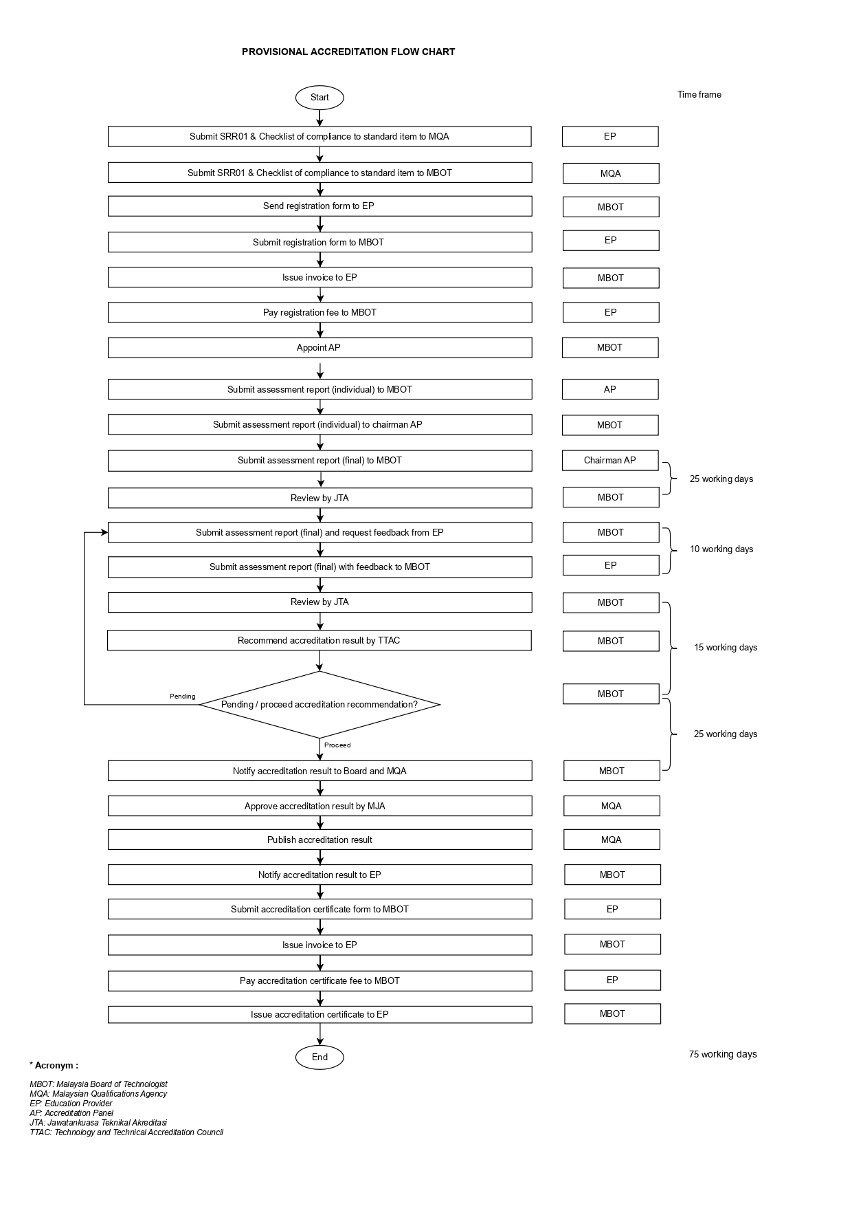 Institutions must submit all required documents to MBOT through MQA using Self-Review Report 01 (SRR01) for evaluation.